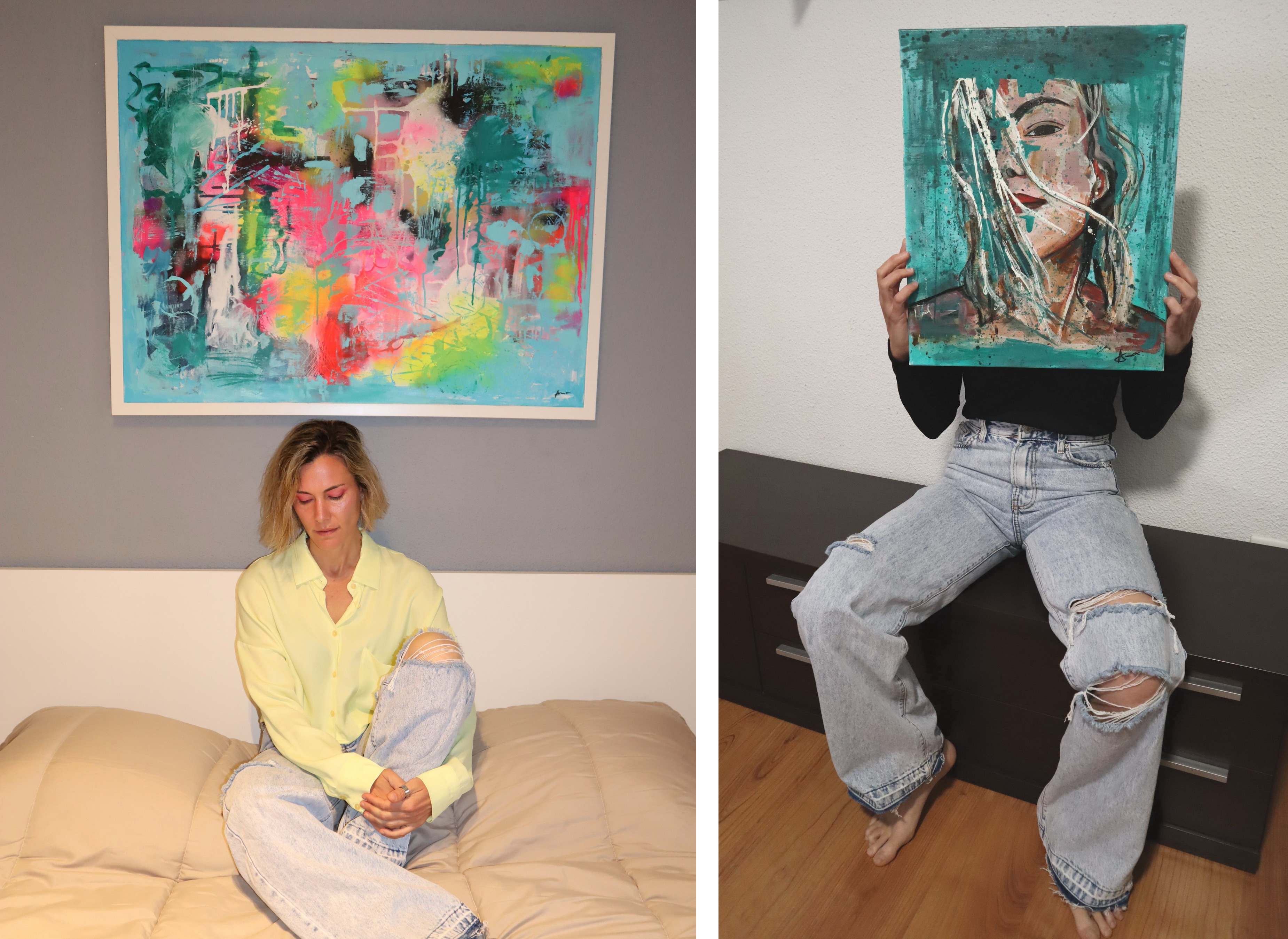 Me encantan todos los colores: colores vivos, explosivos, pinceladas blancas, sprais negros, fosforitos, tonos pastel… yo soy muy escandalosa en mis obras, no puedo evitarlo, no sé hacer cuadros sencillos, no me salen. Pienso que la vida es más bonita con color, más alegre, más necesaria tambien.